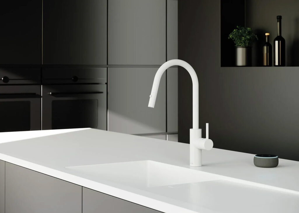 Der Strahlregler der Armatur ist gut durchdacht. Anders als bei typischen Armaturen wurde zwischen dem Strahlregler und dem Rand des Auslaufs absichtlich Platz gelassen. Dieses offene Design verhindert, dass sich Wassertropfen am Auslauf festsetzen. Wenn Tropfen zurückbleiben, sammeln sie sich auf dem Silikonregler, der leicht zu reinigen und bei Bedarf kostengünstig zu ersetzen ist. Das Ergebnis sind weniger Kalkablagerungen, eine einfachere Wartung und eine Armatur, die über eine längere Zeit in gutem Zustand bleibt.